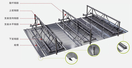 上、下弦鋼筋:采用三級熱軋盤螺鋼筋HRB400級、或冷軋帶鋼筋CRB550級。腹桿鋼筋:采用冷軋光圓鋼筋TD∨、TDM底模鋼板:根據(jù)用途不同,可采用鍍鋅鋼板或冷軋鋼板,常用厚度為0.4-0.5mm雙面鍍鋅量120gm。